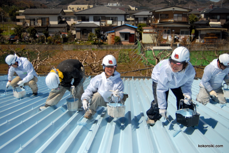 昨日の雨でぬれていた屋根をウエスで綺麗に拭き取り、塗装工程へ進みます。