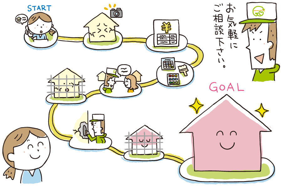 完成までの流れご相談から診断、お見積もり、打ち合わせ等の工事前の流れと、