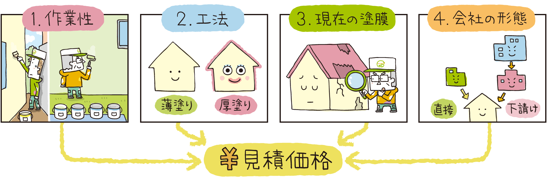 塗装工事の見積の価格は、1. 作業性、2. 工法、3. 現在の塗膜(または下地)状況、4. 会社の形態及び方針によって変わります。